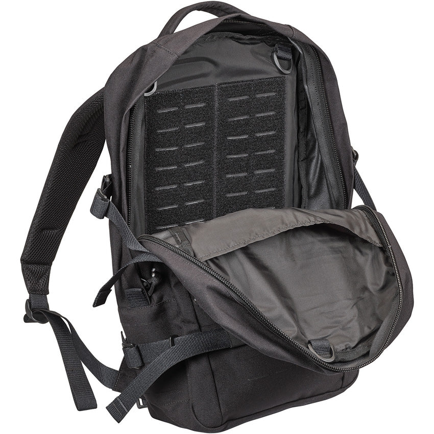 Dimensions: 18" x 11" x 5". Weight: 28oz. 18L capacity. Thermo Mold carry system. Detachable compression straps. Top carry handle. Hydration system compatible (not included). Front compartment with zipper. Front hook and loop closure patch field. Internal D-ring. Fully padded. Laptop/tablet compartment. MOLLE system. Sternum strap. Patch holder. Waist belt. YKK zippers. 700D Cordura construction. Color: Black. Bulk packed.